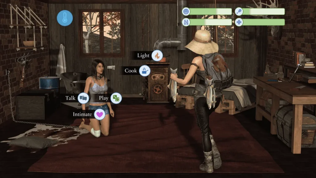 This is where the magic happens. 🏠 The story unfolds through tender, sometimes funny, and often tense moments of education. You teach her words, pointing at objects and patiently listening to her attempts at speech. You show her how to play simple games, rediscovering joy in a broken world. You manage crucial cabin resources, with “fresh meat” taking on a hilariously double meaning as you balance hunting for food and, well, other appetites.